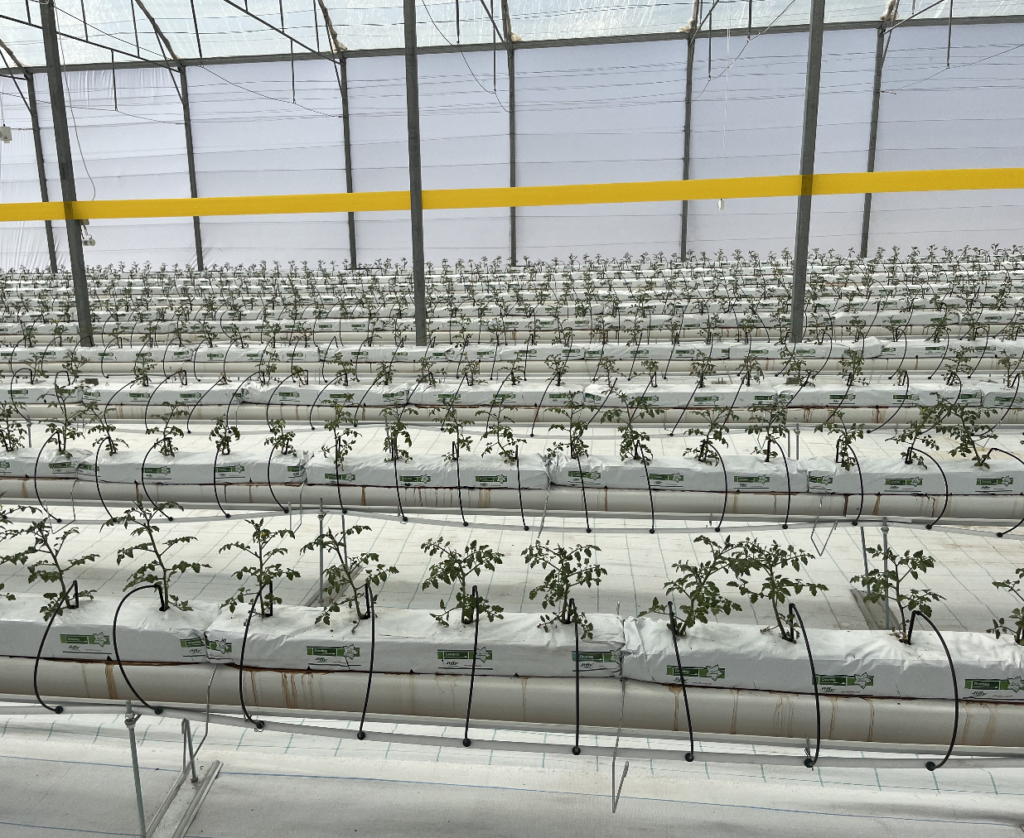 Crops include tomato, pepper, lettuce, and cucumber.