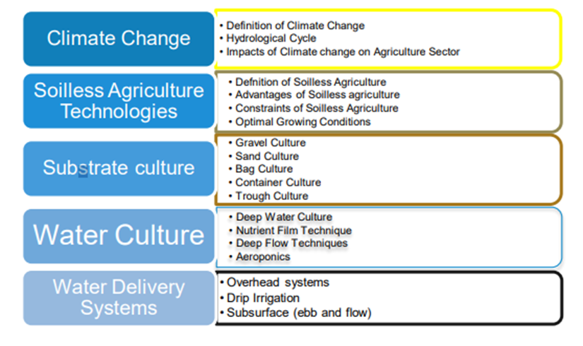 Program material was delivered in four modules over the course of a winter, spring, and summer semester. The four modules included all training content thematically covering soilless agriculture, organic farming, non-conventional water, and drip irrigation. Training combined different educational approaches to provide a holistic set of skills across numerous areas of modern agriculture. The agriculture engineers received a strong schedule of theoretical training in climate smart agriculture, soilless greenhouse agriculture, and drip irrigation systems. Theoretical material was complimented with field visits, hands-on training with software such as AUTOCAD, CROPWAT, and IRRICAD, laboratory tests, as well as visits to agriculture suppliers.